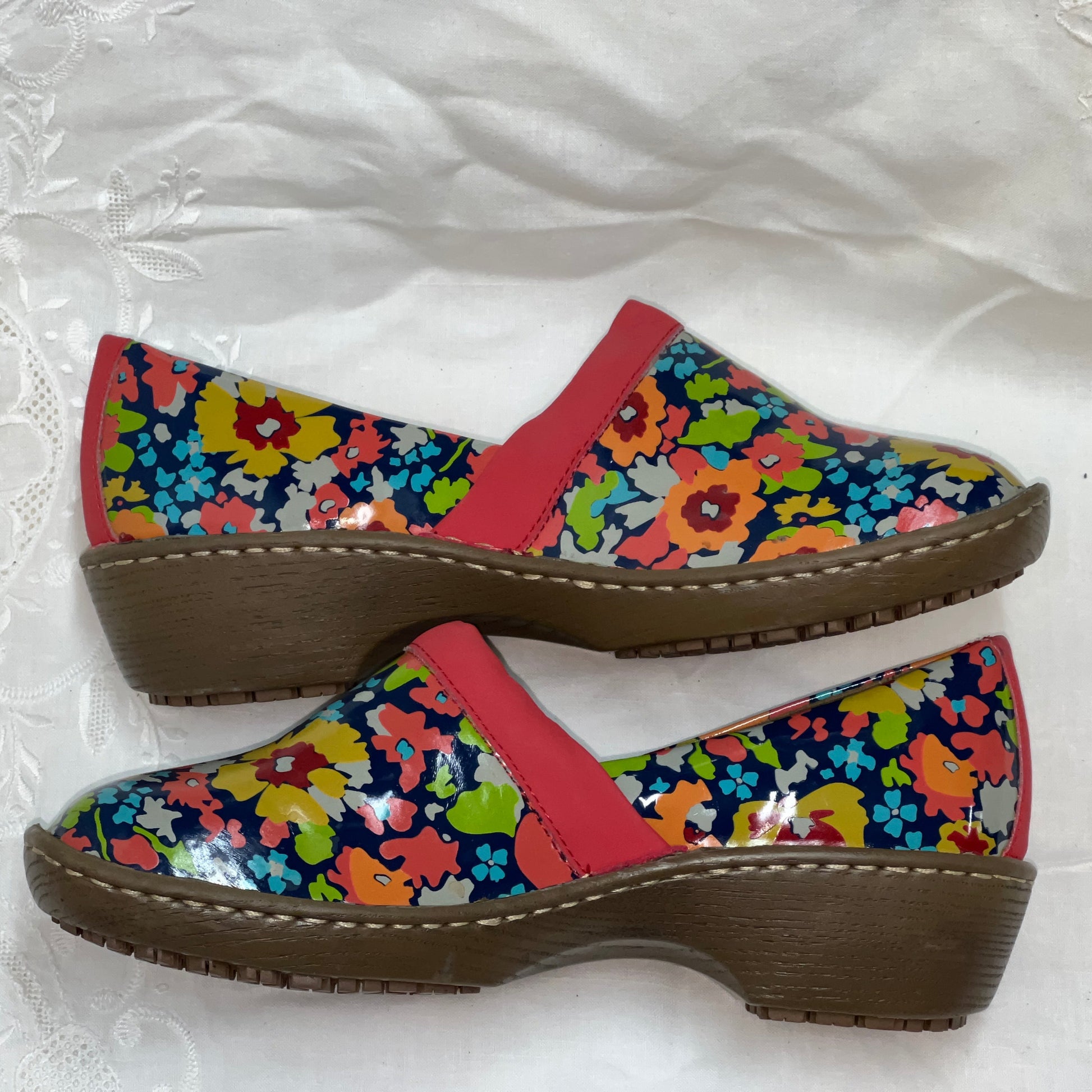 Women’s Lila Non-slip Clog by SureGrip 8.5M Navy/Red Floral Patent