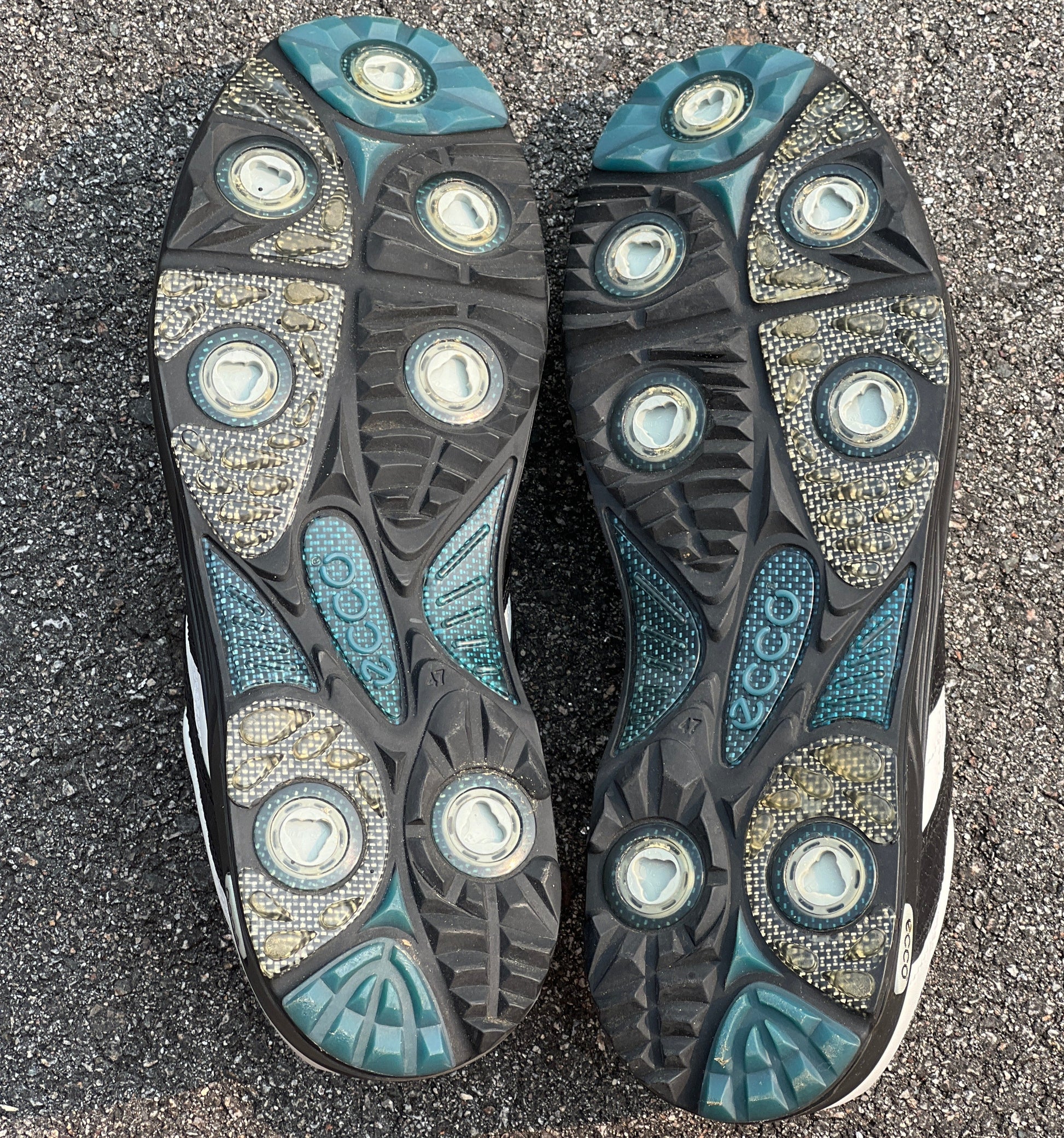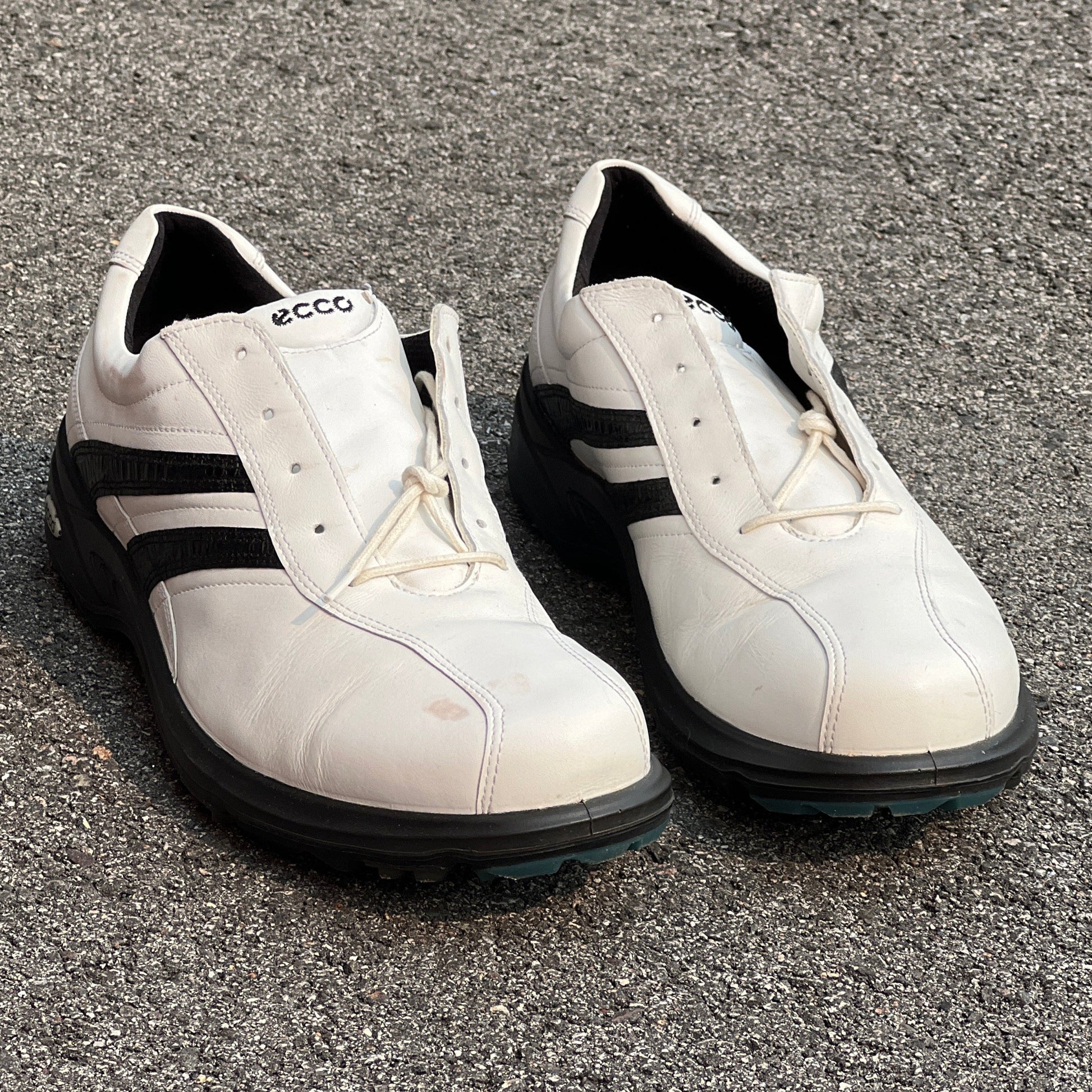 These preowned Men’s Ecco Biom Cleated Golf Shoes feature a white and black leather design in size 47EU. They come equipped with cleats and show only minor scuffs or stains, maintaining good overall condition. Each pair is guaranteed free from any rips, tears, or significant damage, ensuring reliable performance on the course.